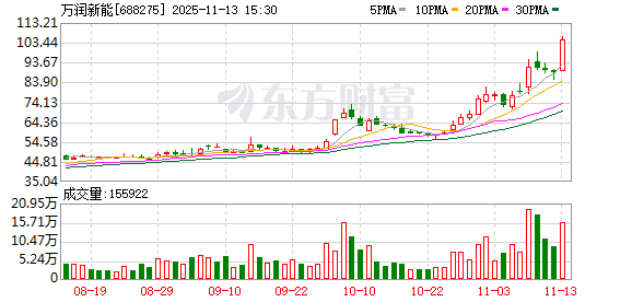 11月13日万润新能(688275)收盘价104.65元,收盘上涨17.82%,全天换手率18.43%,振幅18.96%,成交额15.66亿元。科创板交易公开信息显示,当日该股因日收盘价涨幅达15%等上榜。