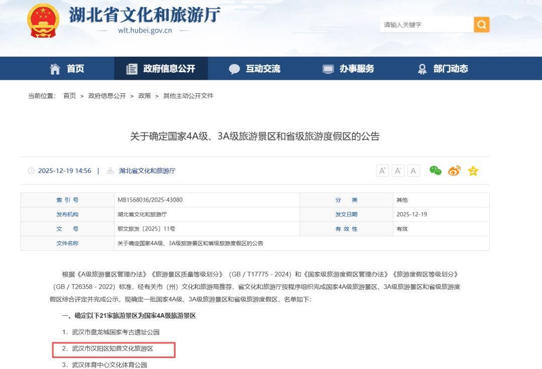 湖北日报讯(记者朱惠、通讯员尚迪爽、朱亚兰)12月19日,湖北省文化和旅游厅发布国家4A级旅游景区认定名单,武汉市汉阳区知音文化旅游区上榜。